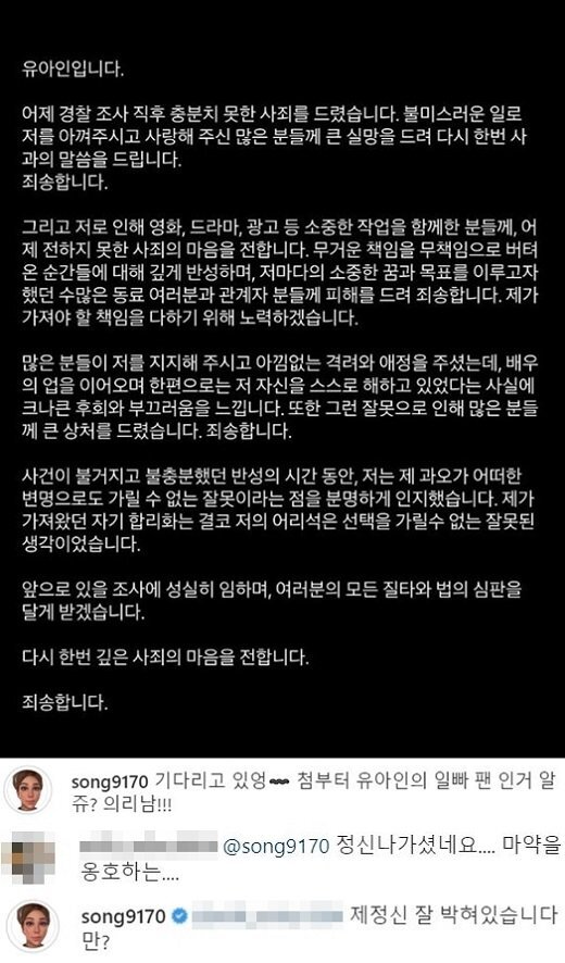 김송, 유아인 사과문 댓글로 공개 응원 표명