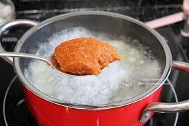 3. 끓이고 있는 물에 된장, 고추장, 다진 마늘을 넣고 잘 풀어줍니다. 간은 직접 맛보며 조절하세요.