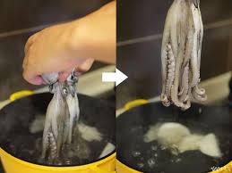 다음으로, 문어를 빠르게 데칠 필요가 있습니다. 물이 끓는 냄비에 문어를 넣고 1분 동안 데치면 문어의 피부가 쉽게 벗겨집니다. 이 작업은 문어를 먹기 좋은 상태로 만들기 위한 필수적인 단계입니다.