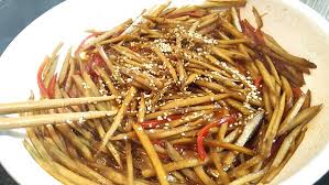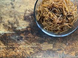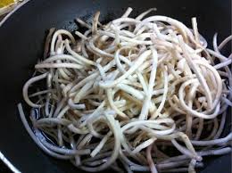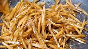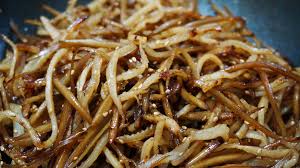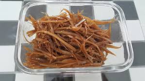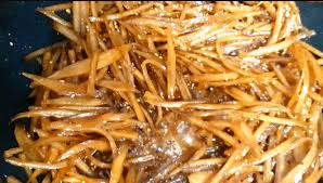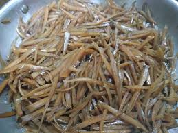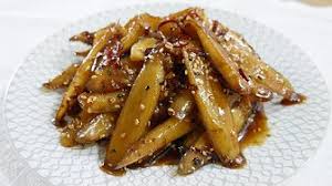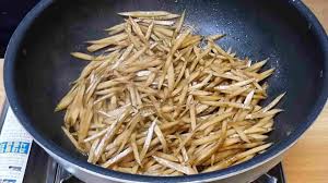 - 볶은 우엉에 간장과 설탕을 넣고 뒤적뒤적 섞어주세요. 간장과 설탕이 골고루 배이도록 해야 합니다.