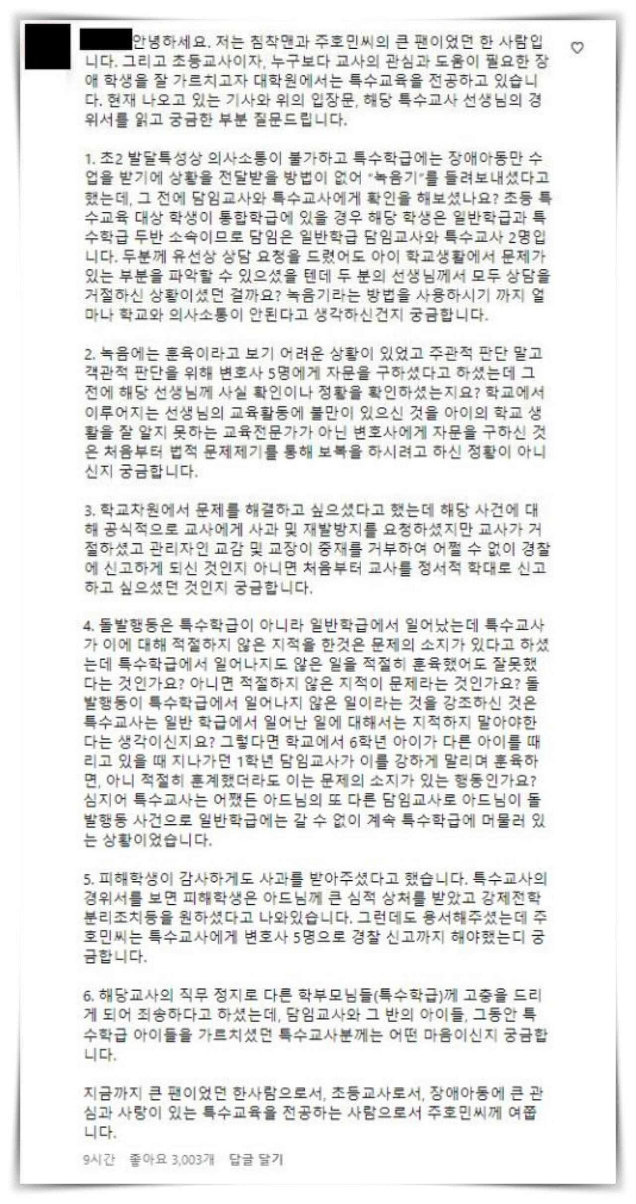 이 댓글을 작성한 네티즌 A씨는 침착한 남자와 주호민씨의 열렬한 팬이자, 특수교육을 전공한 대학원생으로, 누구보다도 특별한 관심과 도움을 필요로 하는 장애 학생들에게 지도를 하는 초등학교 교사로 소개했습니다.