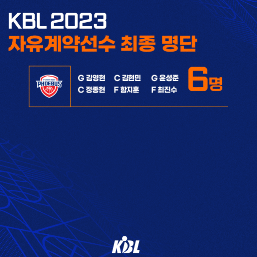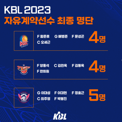 한국프로농구(KBL)는 5월 8일 2023시즌 자유계약선수(FA) 47명 명단을 발표했다. 통합 우승에 기여한 안양 KGC인삼공사의 오세근·문성곤과 준우승팀 서울 SK의 최준용 등 거물급 선수들이 이름을 올렸다.
